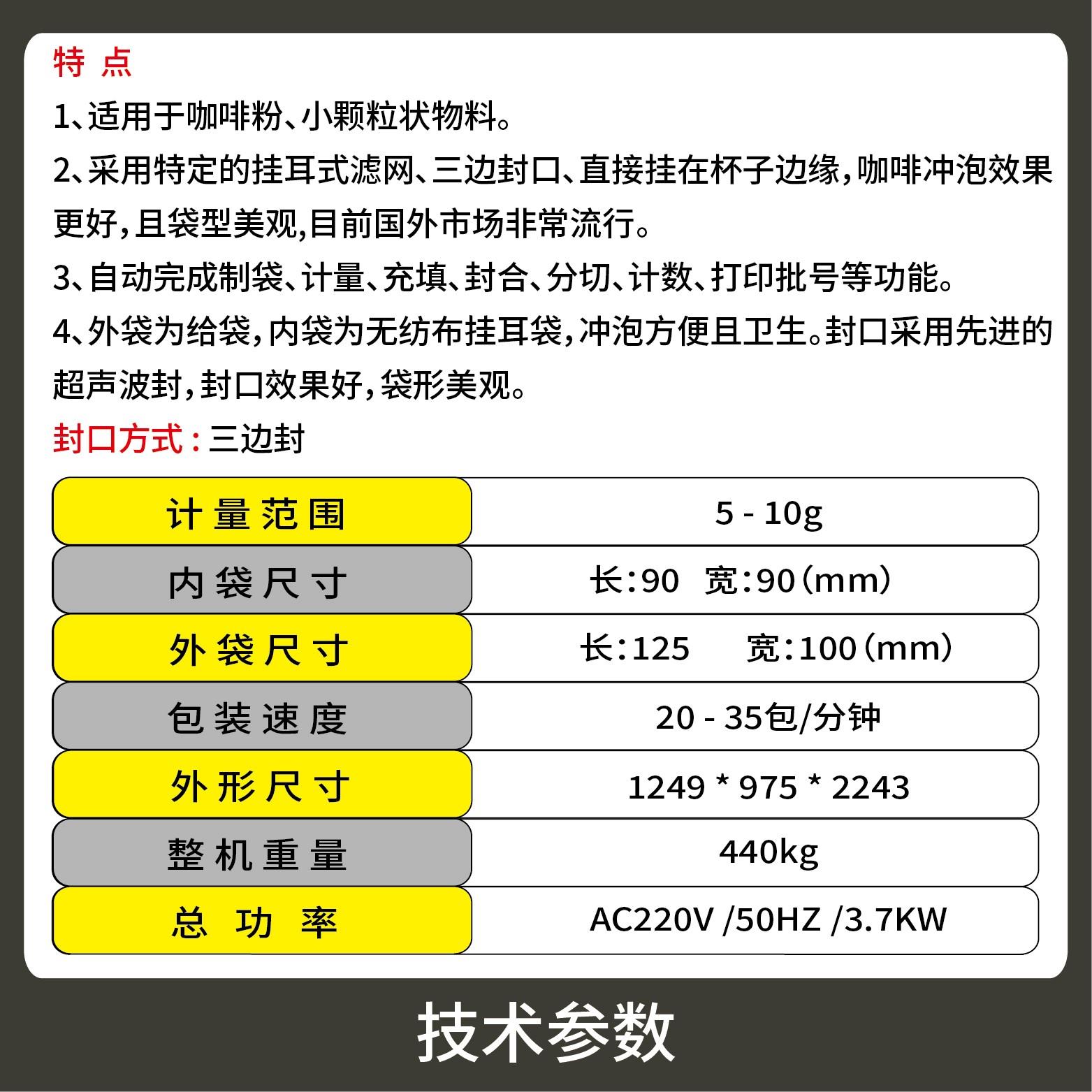 1、采用特定的掛耳式濾網、三邊封口、直接掛在杯子邊緣,咖啡沖泡效果更好,且袋型美觀,目前國外市場非常流行。
